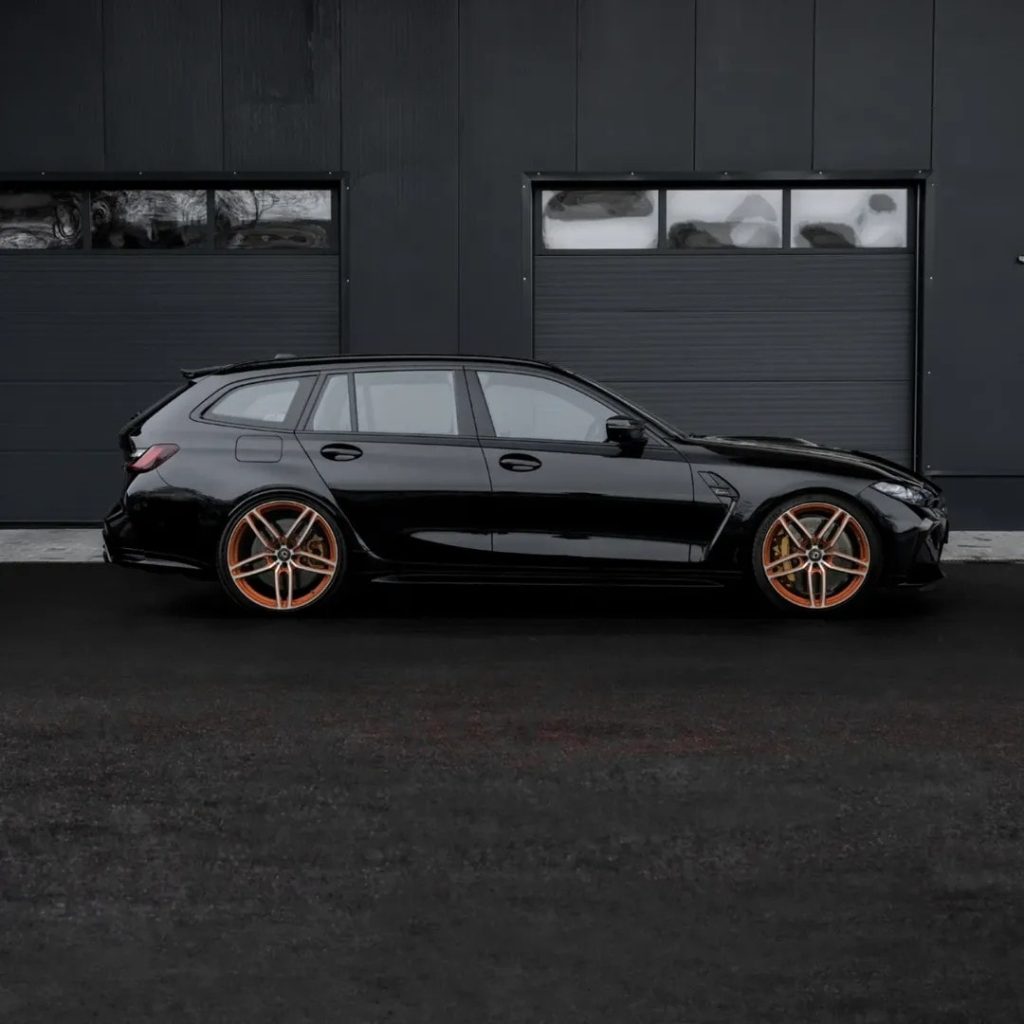 Visually, the photographed car keeps a restrained look, though some details separate it from a regular M3 Touring. Bronze wheels change the overall tone immediately, especially against the dark exterior finish. A few trim pieces also differ from stock. Not many, but enough.