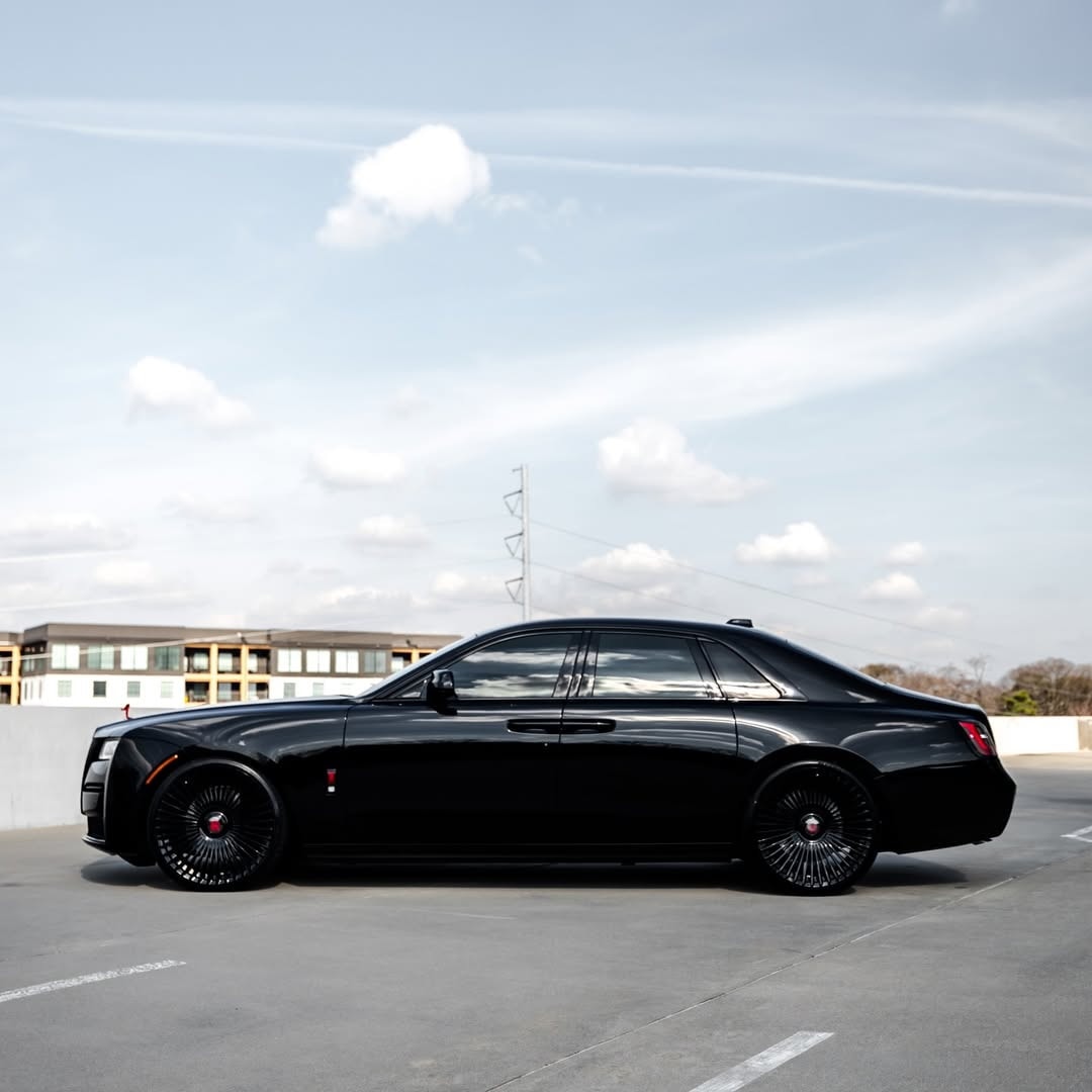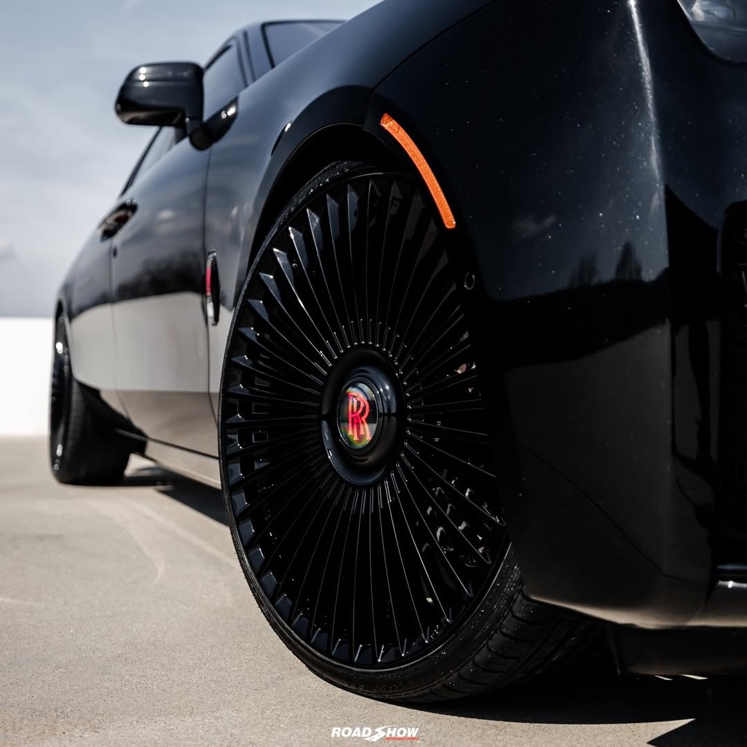 The wheels themselves are hard to ignore because size changes the entire side profile. They use a multi-spoke pattern finished in black, measure 24 inches, and sit inside very thin-profile rubber band tires. The center caps appear to follow a floating-style layout, so the visual focus stays upright even when the car moves—or at least that is how they appear in the images.