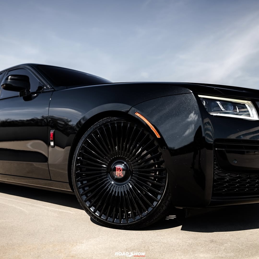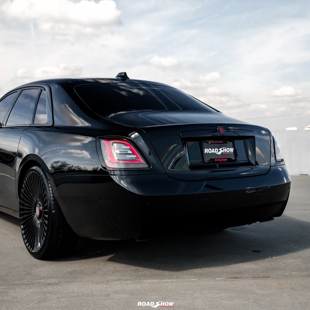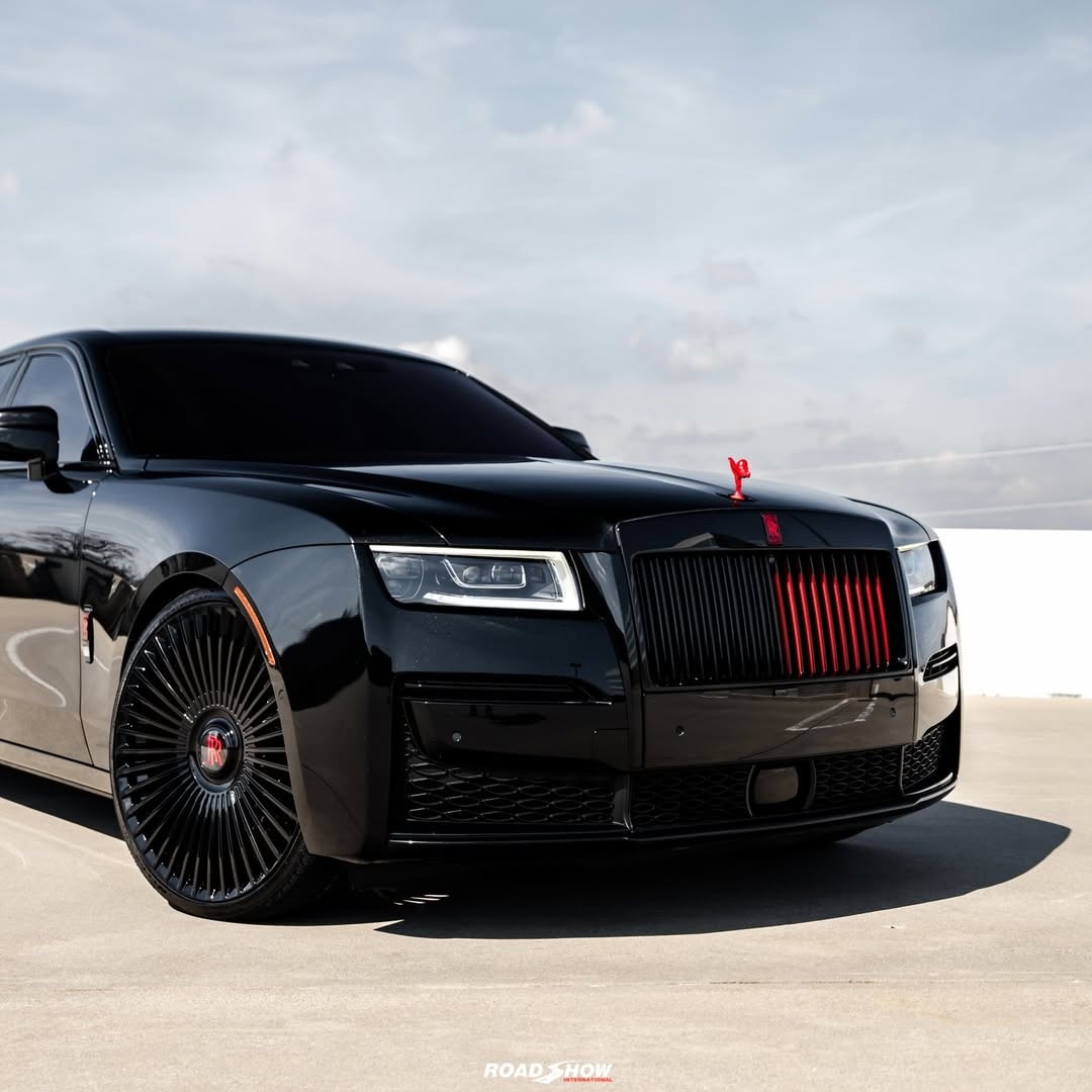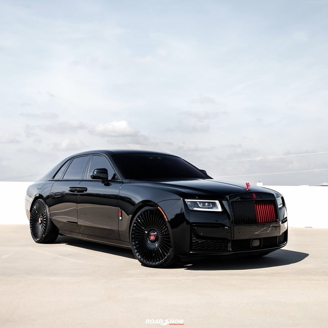 The Rolls-Royce Ghost Series II shown by Road Show International in the media gallery wears a glossy black exterior, interrupted by red details placed carefully rather than everywhere.