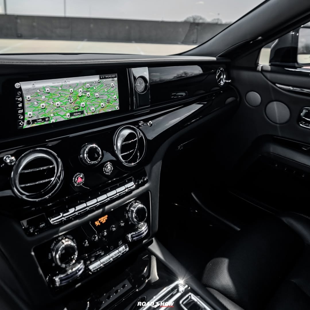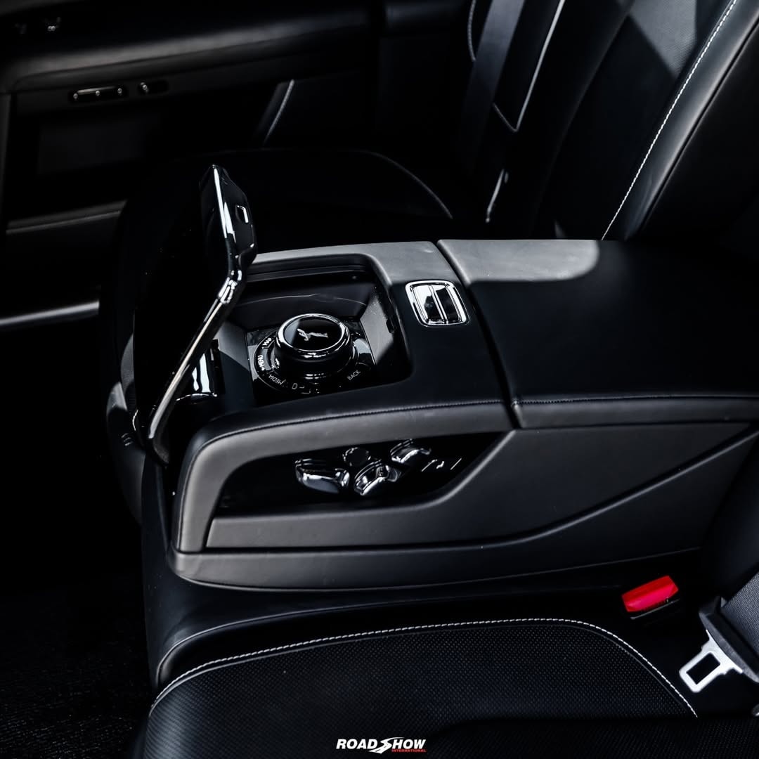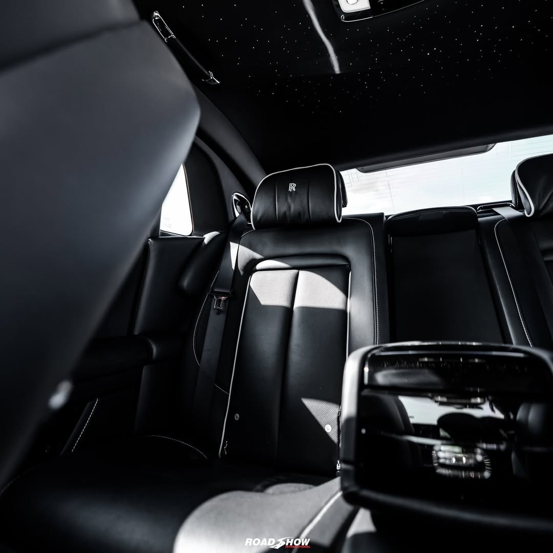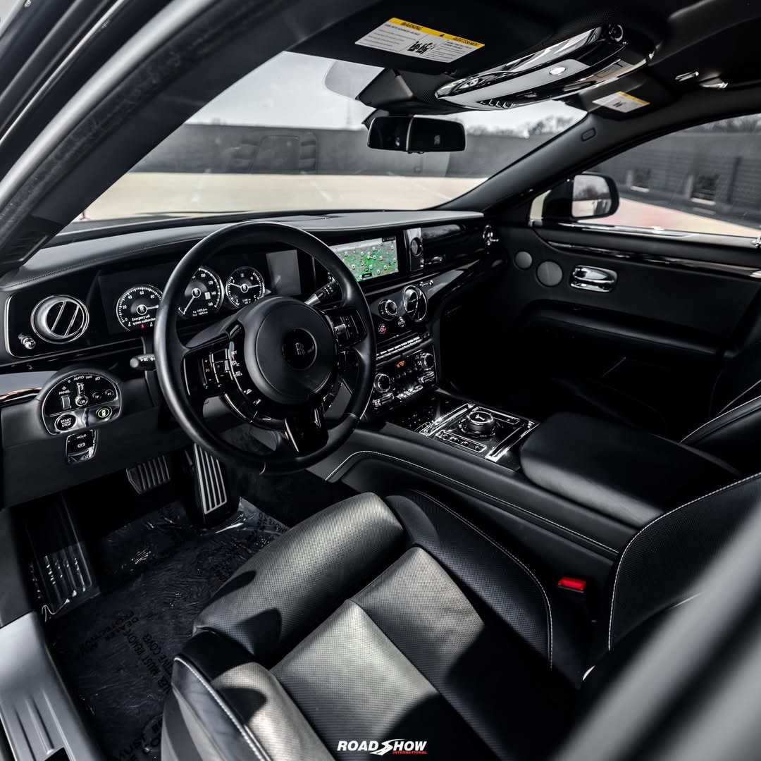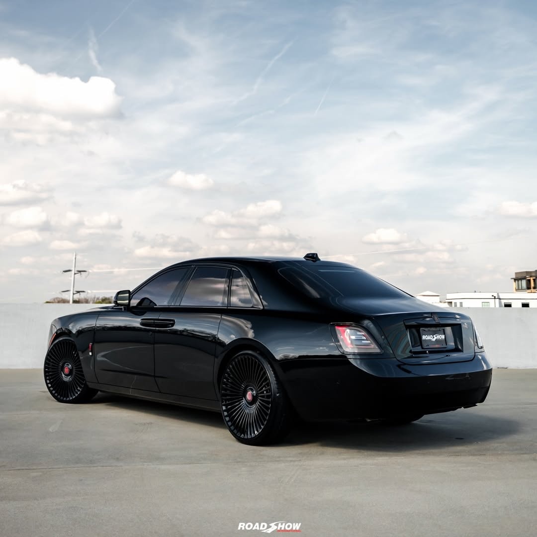 The Rolls-Royce Ghost Series II shown by Road Show International in the media gallery wears a glossy black exterior, interrupted by red details placed carefully rather than everywhere.